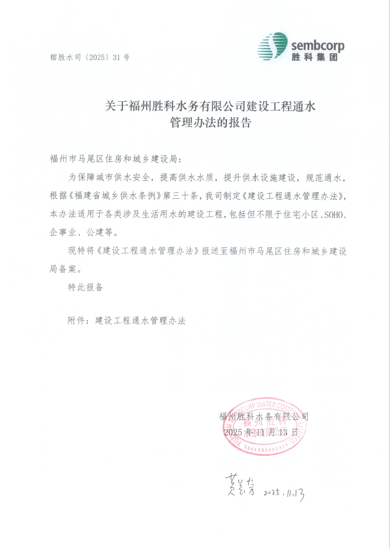 榕胜水司【2025】31号 关于福州胜科水务有限公司建设工程通水管理办法的报告